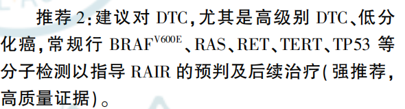 | 甲状腺癌是内分泌系统和头颈部最常见的恶性肿瘤,起源于甲状腺滤泡上皮细胞或滤泡旁细胞。根据起源细胞分为滤泡细胞源性甲状腺癌和滤泡旁细胞源性甲状腺癌(即甲状腺髓样癌,约占1-5%),滤泡细胞源性甲状腺癌包括分化型甲状腺癌(DTC,约占90-95%左右)、嗜酸细胞癌(OCA)、低分化癌(PDTC)和未分化癌(ATC,占比<2%);其中DTC又分为乳头状甲状腺癌(PTC)和滤泡状甲状腺癌(FTC)。过去 30年中,全球范围内甲状腺癌发病率大幅增加,成为十大恶性肿瘤之一。根据国家癌症中心2022年数据,新发甲状腺癌病例为46.61万例,新发病例排名第三位,仅次于肺癌和结直肠癌。今天,我们就聊聊甲状腺癌基因检测的相关内容,希望可以帮助有需要的朋友。如有疑问,欢迎文末添加微信交流。明确诊断是肿瘤治疗的前提,超声引导下细针穿刺(FNA)是甄别甲状腺结节良恶性的重要方法,利用术前FNA可有效提高甲状腺手术恶性肿瘤比例,避免不必要的手术。FNA检测结果分为五类(表2)。  其中I类II类分别为无法诊断或标本不满意、良性,VI类为恶性肿瘤。而III类至V类则为不确定,给临床带来了巨大挑战;研究表明,约有25%的甲状腺结节无法通过FNA确认良恶性,在这25%无法确认良恶性结节的患者中,大多数人选择了手术,但约有80%最终确认为良性,接受了不必要的甲状腺切除手术;因此,III至VI类的良恶性判断决定了甲状腺结节的管理方案制定。近年来,基因检测在协助甲状腺结节良恶性判断取得了较大的进展,如BRAF在乳头状甲状腺癌中突变率高达80%,BRAF突变甲状腺结节恶性风险达99.8%;另外,RAS突变、RET重排、TERT启动子突变及TP53突变等也与甲状腺癌有较强的关系。因此甲状腺癌CSCO指南,CACA指南,NCCN指南及甲状腺癌术后病理诊断专家共识(2025版)均推荐经FNA无法确认良恶性的甲状腺结节进行BRAF、RAS、TERT启动子、TP53等基因进行检测。 外科手术是甲状腺癌最重要的治疗手法,分化型甲状腺癌(DTC)切除术式主要包括甲状腺全切术和甲状腺腺叶切除术,两种方法各有优缺点。在临床手术过程中,部分DTC是选择腺叶切除还是甲状腺全切还存在一定争议,研究表明,携带BRAF基因突变、BRAF&TERT共突变及BARF/RAS&TERE共突变等的甲状腺癌患者有较高的复发风险,优先选择甲状腺全切+同侧中央淋巴结清扫,甲状腺癌基因检测与临床应用广东专家共识(2020版)指出,在手术前,可结合BRAF、RAS合并TERT、PIK3CA突变情况判断复发风险程度,制定个体化手术方案。放射性碘是分化型甲状腺癌重要的治疗手段,可根据适应症、目的和方法的不同分为清甲(清除手术后残留于甲状腺床的甲状腺组织,便于长期随访及肿瘤复发检测)、辅助治疗(辅助治疗降低复发风险等)及清灶治疗(对无法手术切除的局部或远处转移病灶的治疗,延缓疾病进展,旨在改善DSS和OS)。然而部分分化型甲状腺癌出现碘抵抗现象,这部分患者称为放射性碘难治性分化型甲状腺癌(RAIR-DTC),研究表明,BRAF V600E、RET、TERT启动子、RAS及TP53等基因突变与RAIR相关。放射性碘难治性分化型甲状腺癌诊治管理指南(2024版)建议DTC患者进行BRAF等分子检测一直到RAIR的预判和后期治疗。 对于不可手术或放射性碘难治的甲状腺癌患者,靶向治疗是重要的治疗方式。在甲状腺癌中,最常见的突变基因为BRAF V600E突变、RET融合及NTRK融合。与结直肠癌一样,BRAF V600E突变同样是甲状腺癌常见的突变位点之一,2025CSCO滤泡上皮来源甲状腺癌诊疗指南及甲状腺癌NCCN指南指出,携带BRAF V600E突变的甲状腺癌患者可以使用达拉非尼联合曲美替尼进行治疗。除了上述用于BRAF V600E突变的达拉非尼联合曲美替尼外,甲状腺癌相关指南还推荐了两个泛靶点相药物进行甲状腺癌的治疗,包括推荐使用恩曲替尼、拉罗替尼及洛普替尼用于治疗携带NTRK融合的甲状腺癌患者,推荐使用赛普替尼和普拉替尼用于携带RET融合的甲状腺癌患者。与乳腺癌一样,部分甲状腺癌也与遗传相关,家族性遗传甲状腺癌包括遗传性甲状腺髓样癌(HMTC)和家族性甲状腺非髓样癌(FNMTC)。遗传性甲状腺髓样癌(HMTC):研究表明,约有25-30%的甲状腺髓样癌为HMTC,HMTC又分为多发性内分泌肿瘤2A型(MEN2A)和多发性内分泌肿瘤2B型(MEN2B),约有95%的HMTC由RET基因突变导至,95%的MEN2A患者的RET基因在10号外显子的第609、611、618、620位以及11号外显子的第634位密码子发生突变。95%的MEN2B患者携带RET基因第16号外显子M918T突变,不足5%的MEN2B患者携带15号外显子A883F突变。家族性甲状腺非髓样癌(FNMTC):目前尚未发现FNMTC的特异性致病基因。综合征型FNMTC与已知的肿瘤易感基因相关,如APC基因是FAP综合征的致病基因。而在非综合征型FNMTC致病基因的研究中,已发现DICER1、FOXE1、PTCSC2、POT1、TCO、NMTC1 等基因与FNMTC的易感性相关。中国家族遗传性肿瘤临床诊疗专家共识(2021年版)—家族遗传性甲状腺癌建议相关甲状腺癌患者进行RET、APC等基因的筛查以确认遗传风险。以上就是甲状腺癌基因检测的诸多内容,我们欣喜的看到基因检测在甲状腺结节良恶性判断、手术方案制定、放射性碘治疗、靶向治疗及遗传筛查发挥着重要的作用,为甲状腺结节、甲状腺癌的进一步治疗提供强有力的支持,改善相应患者的生活状态。甲状腺细针穿刺细胞病理学诊断专家共识(2023版)放射性碘难治性分化型甲状腺癌诊治管理指南(2024版)中国家族遗传性肿瘤临床诊疗专家共识(2021年版)—家族遗传性甲状腺癌甲状
