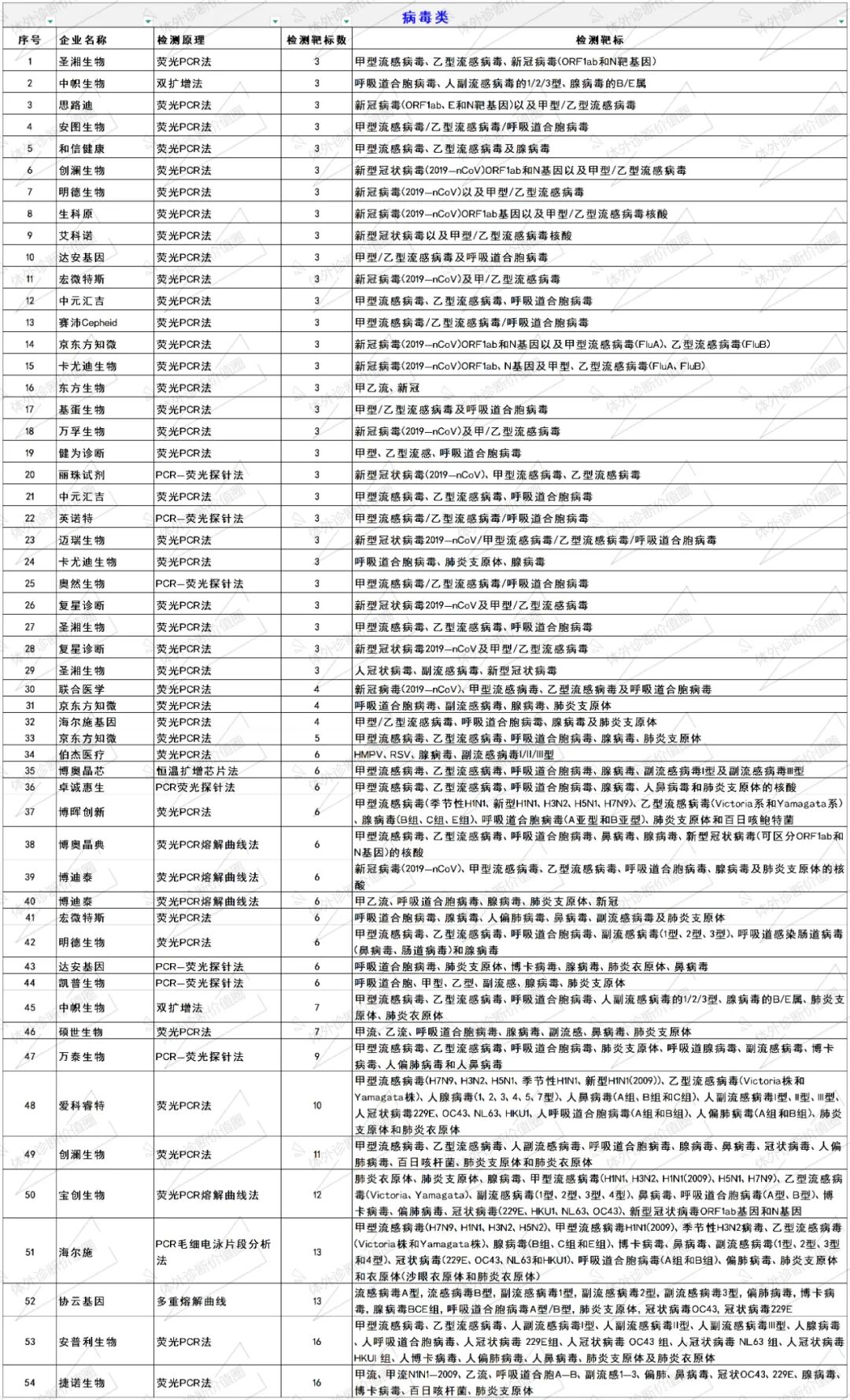 截止目前呼吸道病毒多联检测核酸检测试剂已高达54款,呼吸道细菌多联检测试剂盒11款,共计65款。