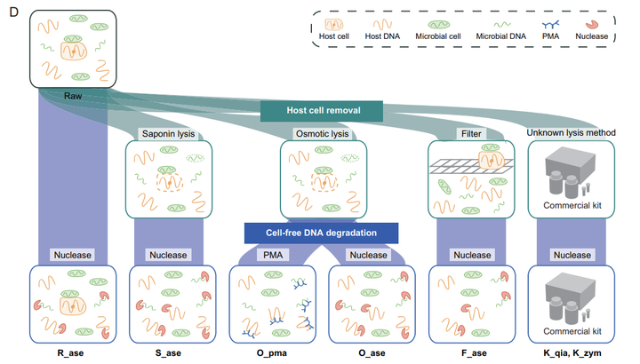 具体到去宿主方式而言,上述提及的去宿主方法有一定的适用场景。例如,只有核酸酶消化的去宿主方式可能相对温和,如果在引入皂苷差异裂解宿主细胞的情况下再加核酸酶消化,可能更为有效。最近新发表的文献指出,滤膜过滤人源细胞和核酸酶消化胞外核酸的效果更佳,但该研究使用的样本为冷冻样本,且滤膜过滤这一操作本身不甚友好,在临床诊断应用场景也需要评估