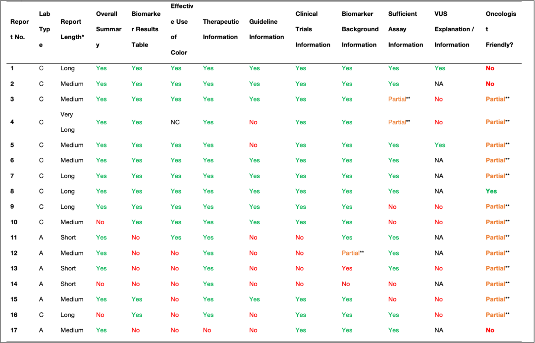 为此,该专家组审阅了17家实验室的NSCLC生物标志物检测报告,并进行多方面评估。尽管17份报告都包含了一些关键要素,但专家组一致认为,这17家实验室的报告中,只有1份报告真正符合肿瘤科医生的需求。