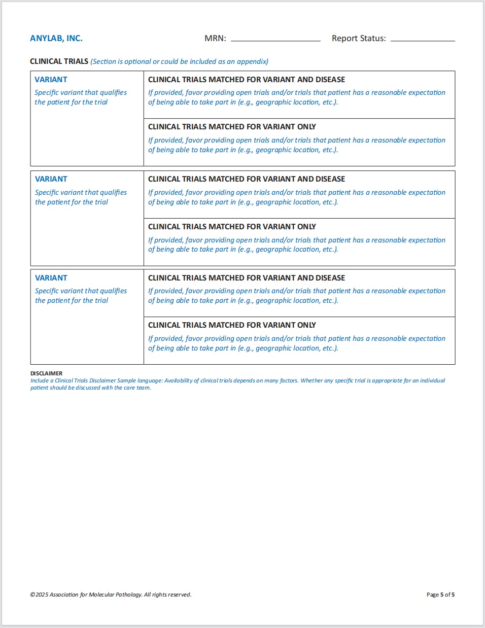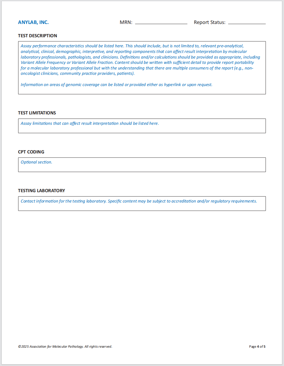 • 格式首选表格:使用基于AMP/ASCO/CAP指南的、有层级的表格(如按治疗意义分级分列)优于长篇叙述。需注意表格在转录EHR时的格式保持问题。