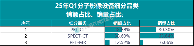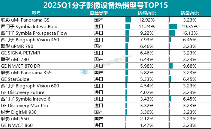 随着核医学技术迭代与肿瘤早筛需求激增,以SPECT/CT、PET/CT、PET/MR 为核心的分子影像设备装机量持续攀升。根据2025年Q1分子影像设备品牌的销额与销量分析,目前该设备市场仍然是以进口品牌为主导,西门子与GE两家的市场销量占比超75%。