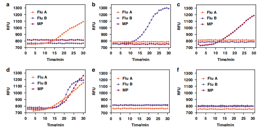 呼吸道感染(RTIs)是全球发病率和死亡率的主要诱因之一。季节性流感、肺炎支原体(MP)、SARS-CoV-2等病原体常同时流行,其临床症状重叠且难以区分,早期精准诊断对指导临床治疗和公共卫生应对至关重要。因此,迫切需要高通量、多病原体检测,通过快速识别大量患者群体中的致病病原体,减轻医院和实验室的压力。目前主流检测技术如RT-qPCR虽具高灵敏度和特异性,但依赖实验室设施。等温核酸扩增技术如环介导等温扩增(LAMP)无需热循环约束且保留高分析灵敏度,但其应用受限于引物设计复杂性及多重检测中交叉引物干扰等问题。微流控技术将样品制备、扩增与检测集成于微型自动化平台,为呼吸道病原体诊断提供了新思路。然而,现有微流控设备仍存在几个局限:(1)通量受限;(2)手动驱动或复杂离心结构;(3)系统集成度低,易导至污染。 近日,杂志Microsystems & Nanoengineering上发表了一篇题为“A fully automated rotary microfluidic platform for high-throughput multiplex detection of respiratory tract pathogens”的文章。作者开发了一种全自动旋转微流控平台(FA-RMP),用于高通量多重呼吸道病原体检测。FA-RMP能够在30分钟内并行处理16个独立的反应,支持同时检测多达4个不同的临床样品。该平台可在30分钟内检测出50拷贝/μL的肺炎支原体DNA,同时支持3种病原体的检测,为临床呼吸道病原体的多重诊断提供了一种很有前景的工具。 图片来源:Microsystems & Nanoengineering 主要内容 FA-RMP整合微流控芯片、光学检测模块及四通道温控系统,整体尺寸为340mm × 255mm × 230mm,重量小于9kg,适用于POCT场景。FA-RMP将温度控制和荧光信号检测集成到全自动工作流程中,能够同时处理多达四个单独的检测通道,从而实现高通量诊断。微流控卡盒采用旋转驱动结构,集成样本裂解、试剂混合与液体分配功能。通过电机驱动转子旋转,控制液体在裂解室、样本加载室与混合室间定向流动,最终将裂解后样本导入预装冻干LAMP试剂的反应室。FA-RMP可在~ 30min内自动完成核酸释放、等温扩增、实时荧光检测等检测过程。 全自动旋转微流控平台(FA-RMP)概述 图片来源:Microsystems & Nanoengineering 作者优化了LAMP反应内引物(FIP/BIP)、外引物(F3/B3)及环状引物浓度,最终确定了内引物20μM(图a)、外引物5μM(图b)、环状引物10μM(图c)。优化Mg2+浓度为4 mM,以平衡扩增效率与非特异性信号抑制(图d)。 LAMP反应体系优化 图片来源:Microsystems & Nanoengineering 利用MP标准培养物,作者研究了FA-RMP的敏感性和特异性。结果显示,FA-RMP对MP-DNA的检测限低至50 copies/μL(图a),在5000–50 copies/μL范围内,阈值时间(Tp)与模板浓度对数呈线性相关(R² = 0.9528),说明FA-RMP具有很好的定量能力(图b)。在8种非目标呼吸道病原体(流感A/B、呼吸道合胞病毒等)检测中均无交叉反应,证明其具有高特异性(图c)。 FA-RMP敏感性、特异性研究 图片来源:Microsystems & Nanoengineering 通过甲型流感、乙型流感和肺炎支原体(MP)的临床样本,作者评估了该系统同时检测多种呼吸道病原体的能力。临床样品经核酸释放试剂预处理后加入微流控卡盒。结果显示,已知的甲型流感、乙型流感和MP样本都在适当的腔室中特异性检测,没有交叉信号(如下图)。这证明了该分析对临床标本的适用性及其在芯片上多重目标的能力。 病原体的多重检测 图片来源:Microsystems & Nanoengineering 作者开发了一种全自动旋转微流控平台(FA-RMP),用于高通量多重呼吸道病原体检测。FA-RMP通过微流控技术、冻干试剂与自动化系统的融合,实现了呼吸道病原体的高通量、快速以及多重检测。FA-RMP具有30分钟内完成4样本并行检测的能力,可达到50 copies/μL的检测限与100%特异性,适用于资源有限环境中多重呼吸道病原体的同步筛查需求。 但尽管FA-RMP在鼻咽拭子检测中表现优异,但对高粘度样本(如痰液)的适用性尚未验证。未来需扩展复杂样本类型测试,并进一步增加临床样本规模及病原体覆盖范围。同时,平台实时荧光采集与模块化腔室结构为未来集成定量分析及数字LAMP提供基础。通过结合多重等温扩增方法与其他病原体引物,可进一步扩展其应用场景。 |
