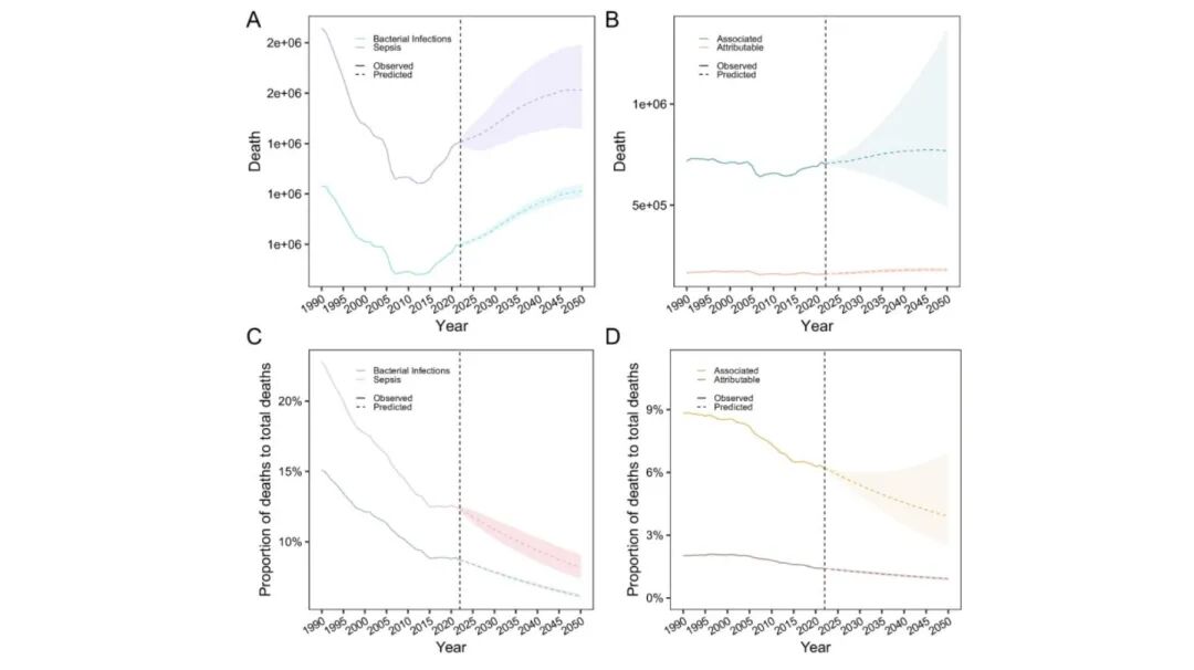 收集2021年全球疾病负担数据库中1990-2021年12种感染综合征、64 种病原体(包括22种AMR相关病原体)和84种病原体-药物组合的AMR数据。在和AMR相关以及归因于AMR的双反事实情景(two counterfactual scenarios)下,采用死亡和残疾调整后的生命年(Deaths and disability-adjusted life years,DALYs)量化AMR负担。利用连接点回归分析评估趋势,并使用自回归综合移动平均方法对截至2050年的AMR发展进行建模预测。