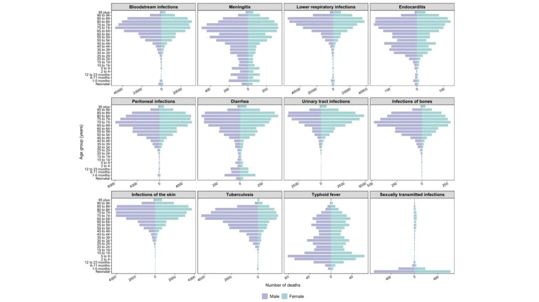 年龄层面:伤寒和性传播感染主要影响10岁以下人群,而其他综合征(如血流感染)在70岁以上人群中死亡率最高。