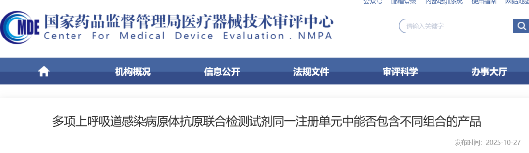 2025年10月27日,国家药监局医疗器械技术审评中心发布关于多项上呼吸道感染病原体抗原联合检测试剂注册单元的问题的回答,明确了多项上呼吸道感染病原体抗原联合检测试剂可在同一注册单元中包含不同组合产品!
