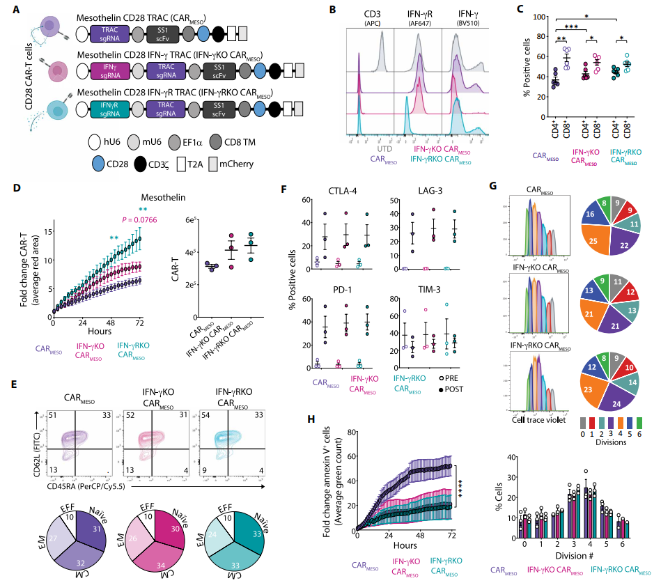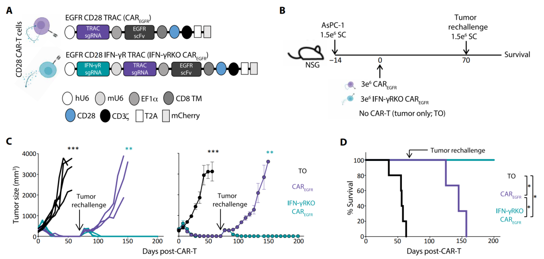 内容概览 近日,国际顶尖期刊《科学》旗下权威医学期刊《科学·转化医学》发表了一项具有里程碑意义的CAR-T细胞疗法研究。该研究由麻省总医院癌症中心细胞免疫治疗项目的Marcela V. Maus教授领衔,Stefanie R. Bailey博士与Hana N. Takei博士作为共同第一作者,联合多个顶尖团队共同完成。 研究团队通过创新性地敲除CAR-T细胞中的干扰素-γ受体,成功打造出新一代“IFN-γ抵抗型”CAR-T细胞。这种细胞在白血病、淋巴瘤、胰腺癌及三阴性乳腺癌等多种小鼠模型中,均表现出更强的扩增能力、持久性和肿瘤清除效果,甚至能建立长期免疫记忆,有效防止肿瘤复发。 研究背景 嵌合抗原受体(CAR)T细胞已彻底改变了血液恶性肿瘤患者的治疗格局,近期更有多款CAR-T疗法获批用于治疗B细胞淋巴瘤、B细胞白血病和多发性骨髓瘤。然而,该领域面临的临床挑战之一是复发问题,其发生主要源于肿瘤的抗原逃逸或CAR-T细胞植入与持久性不足。干扰素-γ(IFN-γ)是一种主要由T细胞和自然杀伤(NK)细胞释放的促炎细胞因子,在癌症中扮演复杂且有时相互矛盾的角色。最近研究证明,在血液肿瘤模型中,嵌合抗原受体(CAR)T细胞产生IFN-γ并非其发挥疗效所必需;而在实体瘤细胞中,IFN-γ受体(IFN-γR)信号传导则有助于CAR T细胞的粘附和抗原特异性细胞毒性。 主要结果 1 敲除IFN-γ或IFN-γR可促进CD28 CAR-T细胞在体外的扩增 本文作者此前曾报道,在靶向CD19、携带CD28或4-1BB共刺激域的CAR-T细胞中,基因敲除IFN-γ能在不影响血液恶性肿瘤抗肿瘤疗效的同时,限制其潜在毒性[2]。此外,我们发现IFN-γ敲除(IFN-γKO)的CAR-T细胞在体外对CD19阳性的Nalm6白血病细胞系表现出更强的扩增能力,尤其是在携带CD28共刺激域的CAR-T细胞中。为更深入研究IFN-γ信号传导对这些过程的影响,我们利用CRISPR-Cas9技术构建了靶向CD19、携带CD28共刺激域,并敲除IFN-γ或IFN-γR的CAR-T细胞。构建体使得我们能够利用一系列CAR-T细胞来研究IFN-γ信号传导的各个方面,这些细胞包括:(i)能够产生并响应IFN-γ的(CAR,对照组);(ii)IFN-γ缺陷型,能够响应但不产生IFN-γ的(IFN-γKO CAR);以及(iii)IFN-γ抵抗型,能够产生但不响应IFN-γ的(IFN-γRKO CAR)。 IFN-γKO和IFN-γRKO CARCD19 T细胞的增强扩增具有抗原依赖性,因为在缺乏抗原或白细胞介素-2的条件下,这些细胞无法存活或扩增。为探究该效应是否普遍适用于各类CAR-T细胞,还是仅限于携带CD28共刺激域的类型,我们构建了靶向CD19、携带4-1BB共刺激域的IFN-γKO和IFN-γRKO CAR-T细胞(图G和H)。与CD28 CAR-T细胞相反,我们发现对于携带4-1BB共刺激域的CAR-T细胞,敲除IFN-γ或IFN-γR并不能增强其在应对肿瘤细胞时的扩增能力(图I)。这些数据表明,IFN-γ信号通路特异性抑制CD28 CAR-T细胞(而非4-1BB CAR-T细胞)的生长。 2 IFN-γKO与IFN-γRKO CARCD19 T细胞在维持抗血液肿瘤活性的同时,于体内展现出更强的持久性 在体外经历多次Nalm6细胞反复刺激后,IFN-γ及IFN-γR敲除的CARCD19 T细胞仍能保持与对照组无异的细胞毒性潜能(图A)。研究人员给携带套细胞淋巴瘤细胞系JeKo-1的NOD SCID gamma小鼠分别输注上述各组CAR-T细胞,并持续监测其肿瘤负荷、生存情况及CAR-T细胞的扩增(图B)。结果发现,尽管存在一定的供体间差异,但IFN-γKO和IFN-γRKO CARCD19 T细胞介导的抗肿瘤效果(图C和D)与小鼠生存率(图E)与对照组CARCD19 T细胞相当。 IFN-γ信号通路敲除对CD19 CAR-T细胞的体外分化及耗竭状态影响甚微。 敲除IFN-γ或IFN-γR可保护靶向CD19的CAR-T细胞免于细胞死亡。 3 IFN-γ信号缺失可增强靶向间皮素的CD28 CAR-T细胞存活能力 与靶向CD19的CAR-T细胞类似,尽管在缺失IFN-γ或IFN-γR的CAR-T细胞中观察到CD4:CD8比率趋向更均衡的明显变化,但所有组别均表现出相似的激活状态和功能特征。活细胞成像分析和基于流式细胞术的微球计数均显示,IFN-γRKO CARMESO T细胞在接触间皮素抗原后表现出更强的扩增能力。当在体外用多种间皮素阳性的胰腺癌细胞系进行攻击时,与对照组CARMESO T细胞相比,IFN-γKO和IFN-γRKO CARMESO T细胞分别针对Capan-2或BxPC-3和Capan-2表现出更强的扩增。与靶向CD19的CAR-T细胞研究结果一致,IFN-γ信号的缺失并未导至CAR-T细胞在分化、免疫检查点蛋白表达或增殖能力方面出现差异。相反,抗原暴露后IFN-γ信号的缺失导至了CAR-T细胞凋亡性死亡的减少。这些数据共同表明,通过敲除IFN-γ,尤其是敲除IFN-γR来阻断IFN-γ信号传导,能够改善CAR-T细胞的存活,这一效果不受靶抗原特异性或表达靶抗原的细胞组织学类型的影响。 通过动物体内实验证明,虽然CAR-T细胞自身产生IFN-γ对于其抗肿瘤效力至关重要,但细胞本身响应IFN-γ的能力并非必需。 4 靶向EGFR的IFN-γRKO CAR-T细胞能够提供抵抗肿瘤再攻击的保护力 敲除IFN-γR能够产生具有长期抗肿瘤活性和生存优势的CAR-T细胞。此外,在对照CAR-T细胞失效的情况下,IFN-γRKO CAR-T细胞展现了抵御肿瘤再攻击的能力。这些数据表明,IFN-γ抵抗型CAR-T细胞在体内具有更强的扩增能力和记忆形成能力。 IFN-γRKO CAR-T细胞在三阴性乳腺癌同系模型中展现更强疗效与生存优势。 内容总结 在本研究中,作者发现IFN-γ会诱导带有CD28胞内信号域的CAR T细胞发生凋亡,而通过靶向IFN-γ或IFN-γR可以减轻这种凋亡。在血液恶性肿瘤中,敲除CAR T细胞的IFN-γR(IFN-γRKO)可在不影响疗效的情况下增强其持久性。在异种移植和同系实体瘤模型中,IFN-γR敲除的CAR T细胞表现出更强大的肿瘤控制能
