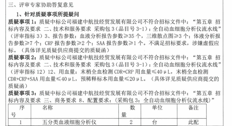 公告显示,全自动血细胞分析仪流水线成功中标,成交金额为0.01元,供应商为漳州片仔癀医疗器械有限公司。 ![]() 8月27日,该项目发布第一次中标公告,公告显示,两家IVD企业的全自动血细胞分析仪流水线以单价为0.01元成交,中标供应商为福建中航技经贸发展有限公司。 ![]() 9月11日,该项目发布结果更正公告。公告指出,合同包3(全自动血细胞分析仪流水线)的采购结果作废,项目重新招标。 废标原因为:质疑事项成立且影响或者可能影响中标、成交结果。 ![]() 质疑内容: