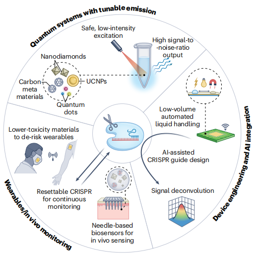 已有研究将CRISPR工具整合到可穿戴设备比如口罩中,以实现病原体检测,但当前仍局限于单次测量。未来需开发可重置的CRISPR系统,结合生物相容性纳米材料,实现连续监测。未来,AI可用于指导crRNA设计、光谱去卷积和结果解读。通过机器学习优化CRISPR引导序列的选择性,提高复杂样本中的检测准确性。未来还可将纳米材料用来优化多重检测。量子点、上转换纳米颗粒等可调发射纳米材料,结合光谱多路复用技术,可在单一设备中同时检测基因组、转录组、蛋白质组等多类生物标志物。