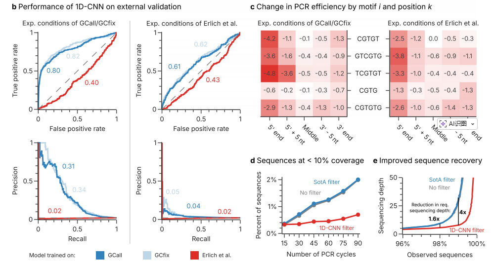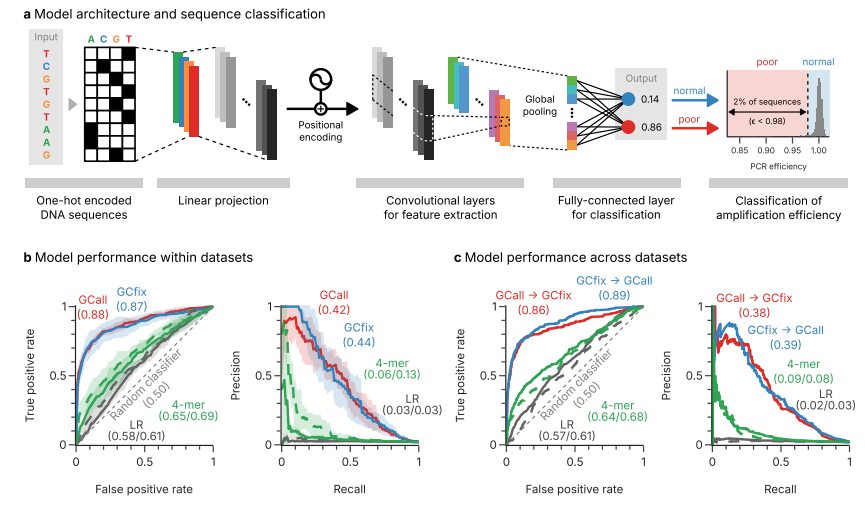 传统上,PCR用于扩增单个目标序列,而大规模平行测序的出现需要同时扩增许多共享短末端adapter的短序列模板。这种多模板PCR现在是许多常规测序准备工作流程的基础,并用于许多领域,比如定量分子生物学、DNA数据存储。然而,同时扩增许多模板也带来了挑战,最关键挑战在于不同DNA模板因序列特异性导至的非均匀扩增现象。这种扩增偏差会显著扭曲扩增子丰度数据,影响定量结果的准确性和灵敏度。传统PCR优化策略(如引物设计、退火温度调整)在单模板扩增中效果显著,但面对含数千个模板的复杂体系时,传统方法难以解决由序列本身特性引起的效率差异问题。 近日,瑞士联邦理工学院在杂志Nature communications上发表了一篇题为“Predicting sequence-specific amplification efficiency in multi-template PCR with deep learning”的文章。本研究开发了具有位置编码功能的1D-CNN模型,能够仅基于序列信息预测扩增效率,在内部验证中AUROC达到0.88,AUPRC达到0.44,表现出卓越的预测性能。研究还提出了名为CluMo的深度学习解释框架,成功识别出与低扩增效率密切相关的特定序列 motif,并发现了adapter介导的自引物形成是导至低扩增效率的主要原因。 图片来源:Nature communications 主要内容 多模板PCR中的非均匀扩增 作者在90个PCR循环中,对具有共同末端引物结合位点的12,000个随机序列的扩增子覆盖率变化进行了跟踪。结果显示,在连续扩增过程中,相当数量的扩增子序列要么严重不足,要么在测序数据中不再存在(下图b)。且分析表明观察到的一些序列的低扩增效率并不是由序列的GC含量引起的。 量化分析显示约2%的随机序列存在显著低于平均水平的扩增效率(相对效率低至80%),这些序列在60个循环后几乎从测序数据中消失(下图c)。实验表明,这些扩增效率较低的序列是与它们的序列有关。 多模板PCR中固有的非均匀扩增。图片来源:Nature communications 位置序列信息对于预测扩增不良至关重要 作者深入研究了实验中表现最差的 2% 序列(下图 a)。以 GC 含量和碱基频率作为特征的回归模型表现不佳(下图 b、c 中的灰色线),这表明某些序列扩增不良不能仅用碱基组成或 GC 含量来解释。 作者训练了三种深度学习模型:RNN、1D-CNN和带位置编码的1D-CNN。其中带有位置编码的1D-CNN模型表现最佳,使用五重交叉验证,平均AUROC分别为0.88和0.87,平均AUPRC(精确度-召回率曲线下面积)分别为0.42和0.44(下图b)。研究进一步验证了模型的泛化性(下图c),且引入位置编码对1D-CNN的性能有很大影响,表明扩增效率低主要是由于模板序列中的位置特异性特征。 位置序列信息对于预测扩增不良至关重要。图片来源:Nature communications 与低PCR效率相关的位置基序 作者开发了一种基于DeepLIFT的基序发现方法CluMo,来试图阐明低PCR效率相关的序列特征,并成功发现了几个与低扩增效率密切相关的位置基序。结果显示,大多数基序包括一个共同的CGTG子序列,且这些基序明显倾向于靠近引物结合位点(下图c)。 进一步研究发现,adapter介导的自引物形成(adapter-mediated self-priming)是导至低扩增效率的主要原因。CGTG等motif与5'端adapter序列形成发夹结构(下图f),在标准退火温度下也易形成,从而抑制引物退火并促进无效扩增产物形成。在3 '方向上移动基序延长发夹环会降低其热力学稳定性,从而降低对扩增效率的预期影响,这解释了在扩增效果较差的序列中,观察到的基序在5′-末端的位置富集。 与低PCR效率相关的位置基序。图片来源:Nature communications 模型性能和基序假说的外部验证 为了验证1D-CNN模型的性能和识别出的基序的抑制效果,作者在外部实验室制备并扩增了另一个寡核苷酸库。结果确认了模型在跨机构数据上保持稳定性能(AUROC 0.8,AUPRC 0.3,下图b)。作者还将10种基序随机插入到40种随机选择的序列中,每个序列在5个不同的位置,结果观察到不同的基序和位置对PCR效率有不同的抑制作用(下图c,左)。CGTG相关的基序在5′-和3′-端最为突出。综上所述,外部验证的结果有力地支持了CluMo识别的基序效应和训练模型的鲁棒性。 模型性能和基序假说的外部验证。图片来源:Nature communications 总结与讨论 本研究开发了具有位置编码功能的1D-CNN模型,能够仅基于序列信息预测扩增效率,在内部验证中AUROC达到0.88,AUPRC达到0.44,表现出卓越的预测性能。研究还提出了名为CluMo的深度学习解释框架,成功识别出与低扩增效率密切相关的特定序列 motif,并发现了adapter介导的自引物形成是导至低扩增效率的主要原因。 这项研究不仅解决了多模板PCR中长期存在的扩增偏差问题,更重要的是提供了一套从数据生成到机制解析的完整研究范式,为理解复杂序列功能关系提供了新的技术路径。通过精准预测和优化扩增效率,该技术有望推动DNA数据存储技术向更高密度、更可靠方向发展,同时为精准医疗等领域的分子诊断技术提供重要支撑。 |