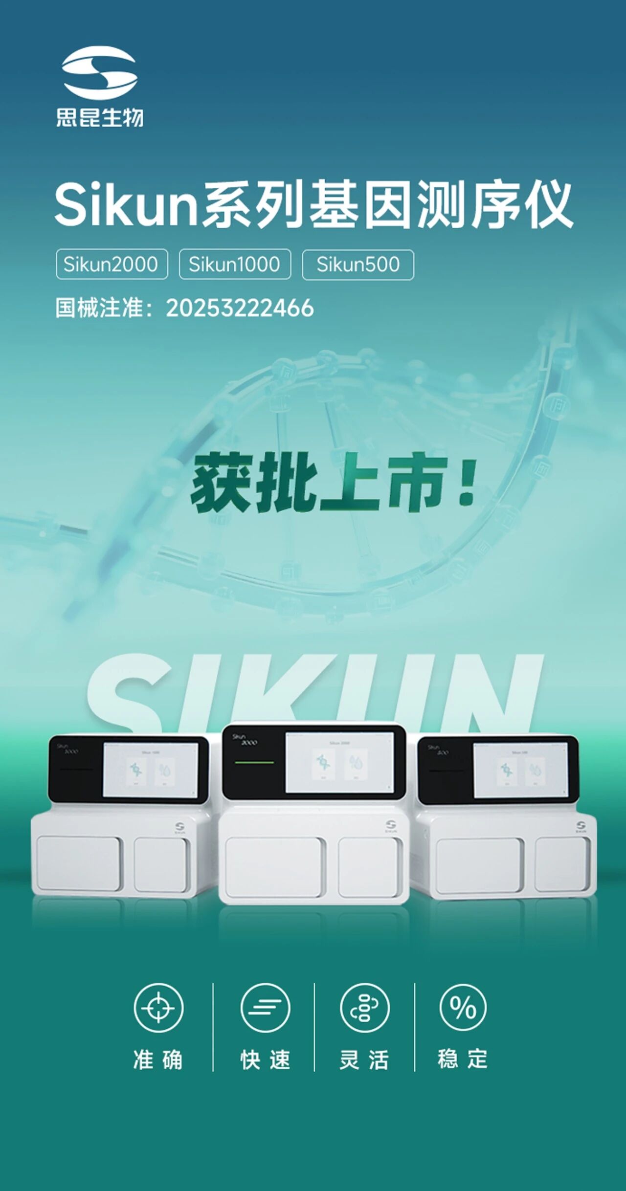 近日,思昆生物基于"可逆末端终止测序法"的Sikun系列基因测序仪(Sikun 2000、Sikun 1000、Sikun 500)获批NMPA三类医疗器械注册证(国械注准20253222466),标志着其在国内获准临床应用。 国产合规:“进口替代”到“自主创新” "可逆末端终止测序法"这一技术路线在全球测序检测市场中占比超过八成,具备高度的技术成熟度与生态兼容性。基于此优势,Sikun系列基因测序仪能够无缝对接主流试剂与数据分析流程,协助医疗机构在延续现有操作流程的基础上实现测序平台的平稳过渡,在保障数据质量稳定的同时,显著节约平台替换带来的人力和时间成本。 依托本土化研发与生产优势,思昆生物正构建从仪器试剂配套到数据分析的完整产业生态链。作为生态链的核心,Sikun系列基因测序仪的获批展现了国产设备在国际通用技术路线上的实践能力,将推动我国基因检测行业向自主创新持续迈进。 临床赋能:推动精准医疗普惠应用 思昆生物自主研发的高通量测序仪正式获证并投入临床应用,该设备在检测效率、平台适应性与操作体验等方面的创新性设计,将有效推动基因检测技术在各级医疗机构的标准化应用与规模化普及。 兼具速度与准确,保障临床效能 思昆测序系统依托全自主研发的生化反应体系、测序芯片与信号处理等技术,在保证测序质量稳定达到临床要求的前提下,显著缩短了检测周期。 其高精度测序流程与实时监测系统,确保在快速运行模式下仍能提供高准确性的测序结果,满足肿瘤基因检测、遗传病筛查及病原微生物鉴定等感染相关项目对时效与精准度的双重需求,为急危重症感染患者的诊疗决策提供及时可靠的检测保障。 规格灵活,应对多样场景 思昆测序平台提供从60M至660M的六种芯片规格配置,精准覆盖不同规模医疗机构的差异化需求。 多梯度芯片通量设计,既可满足基层医院小批量、常态化的检测任务,又能高效承接区域检验中心的高通量筛查与突发性样本检测,以灵活的配置方案助力医疗机构实现资源优化与效能提升。 便捷友好,赋能一线操作 以临床实际需求为导向,通过即用型试剂盒与智能感知系统的协同设计,思昆测序系统实现了从耗材装载到设备维护的全流程自动化。每次测序任务完成后,系统自动启动清洗程序,确保设备持续处于最佳工作状态,有效避免交叉污染风险。 高度集成化的操作模式,大幅度降低了基因检测技术的使用门槛,使各级医疗机构都能快速建立稳定的检测能力。 此次获证是思昆生物发展历程中的重要里程碑。我们将持续创新,为各级医疗机构提供更优质的基因检测解决方案,并与业界伙伴携手共进,共同推动中国精准医疗事业的蓬勃发展。 |