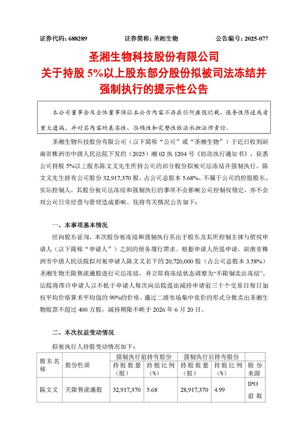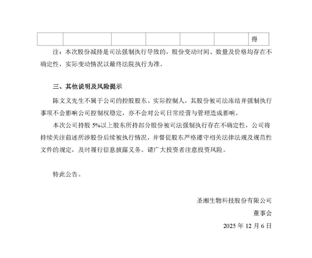 12月5日公告,圣湘生物科技股份有限公司于近日收到湖南省株洲市中级人民法院下发的(2025)湘 02 执 1204 号《协助执行通知书》,获悉公司持股 5%以上股东陈文义先生所持公司的部分股份拟被司法冻结并强制执行。