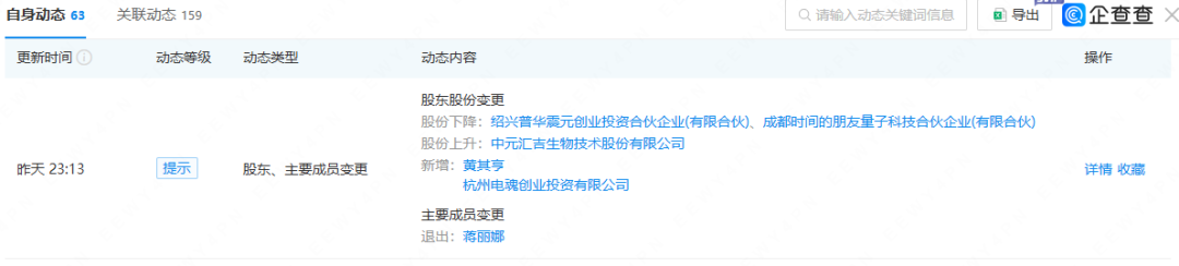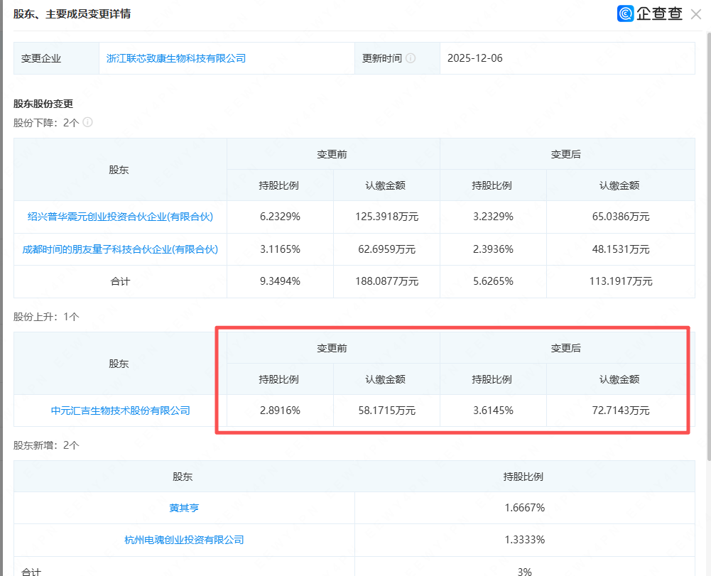 | 12月6日,据企查查消息,中元汇吉生物技术股份有限公司在浙江联芯致康生物科技有限公司中的持股比例自2.8916%上升至3.6145%!浙江联芯致康生物科技有限公司成立于2021年,位于柯桥经开区(金柯桥科技城),由高层次人才郭教授创立,以“酶膜协同+自主智造”为核心,聚焦代谢与生命体征动态监测领域,致力于打造全球领先的动态监测平台,推动临床诊疗与健康管理的智能化升级。