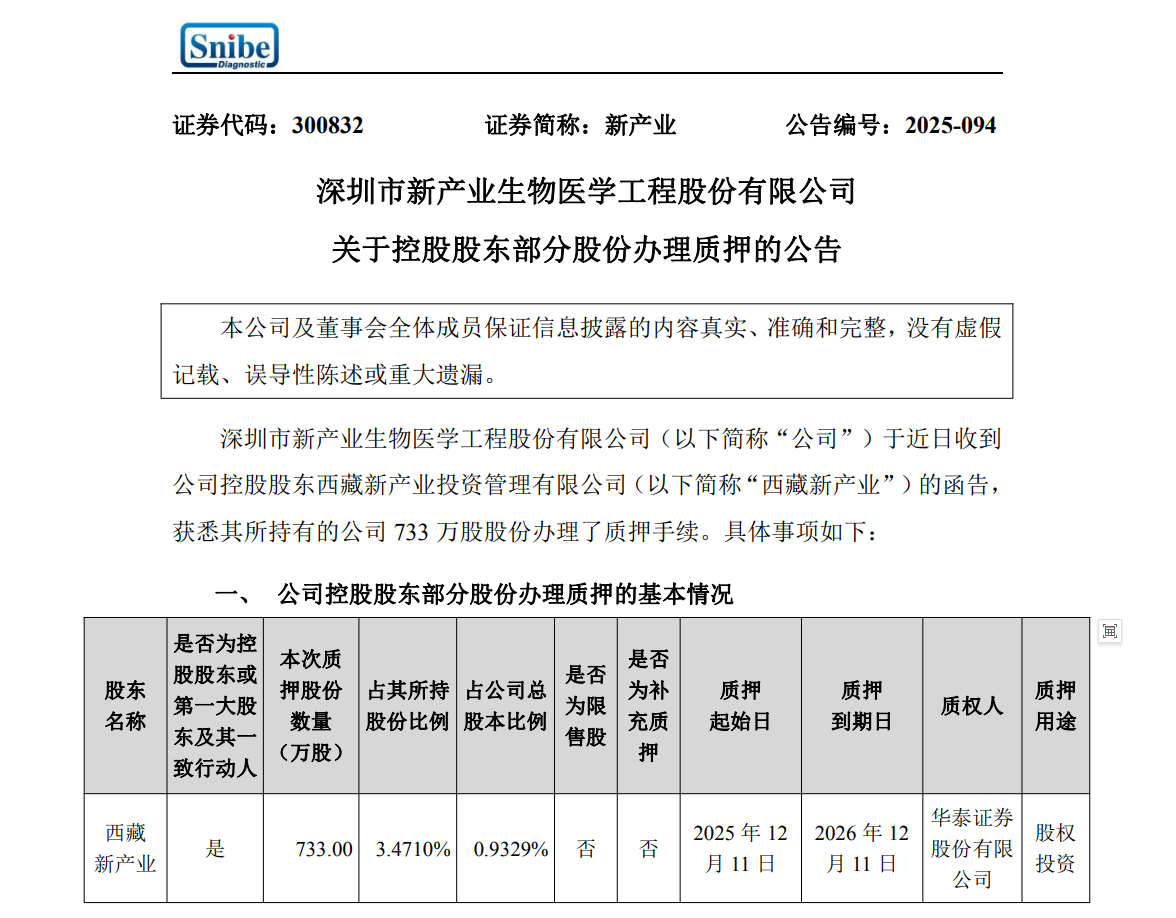 12月12日,新产业发布公告称,其控股股东西藏新产业投资管理有限公司办理了部分股份质押手续。西藏新产业本次质押股份数量为733万股,占其所持股份的3.471%,占公司总股本的0.9329%。质押起始日为2025年12月11日,到期日为2026年12月11日,质权人为华泰证券股份有限公司,质押用途为股权投资。