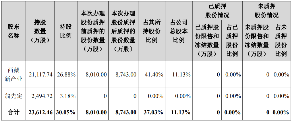 截至公告披露日,西藏新产业累计质押股份情况如下: