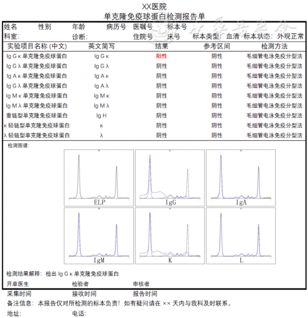 检测报告单的格式和内容是确保检测结果准确传达的重要环节。如果检测结果为阳性,应详细说明阳性条带的强度,报告应明确列出完整M蛋白的类型(如IgGκ、IgAλ、IgM λ等)、重链型M蛋白(如IgG重链)及其轻链类型M蛋白(κ或λ);若为可疑阳性结果,在相应的M蛋白报告项目中报告“阳性”,并建议患者定期复查。建议在报告中描述是否存在免疫抑制现象。免疫抑制主要表现为正常多克隆免疫球蛋白产生受到抑制,但并非所有患者都会出现,由于免疫功能受损,患者更容易发生感染,且感染的严重程度可能更高;其感染程度与MM的疾病分期呈正相关,晚期患者更易出现。免疫抑制的严重程度和持续时间因个体差异而异,需要结合患者的临床表现和实验室检查结果进行综合评估。