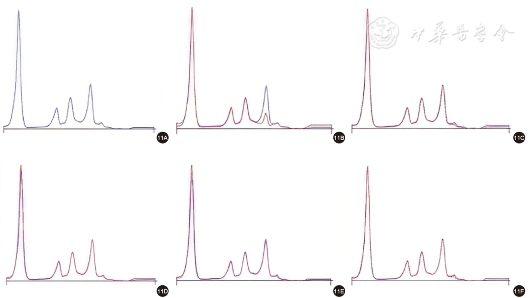 图11 γ(IgG)重链型毛细管电泳免疫分型图[11A为血清蛋白电泳图;11B~11F分别为血清与 IgG、IgA、IgM 的重链、总轻链κ、总轻链λ抗体结合后的电泳图;黑色曲线为未加入抗体前待检血清的电泳图,红色曲线为加入抗体后的电泳图。与未加入抗体前的电泳图比较,仅见IgG重链泳道发生消减,在对应的κ和λ泳道没有发生消减,则认为存在γ(IgG)重链型的单克隆Ig组分]