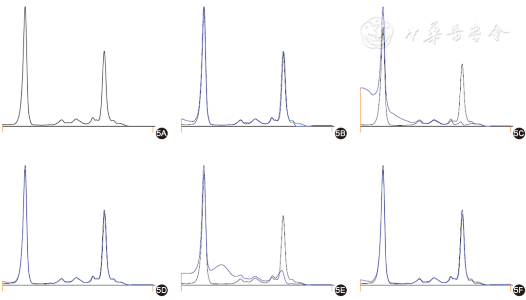 图1 单克隆免疫球蛋白阴性毛细管电泳免疫分型图(1A为血清蛋白电泳图;1B~1F分别为血清与 IgG、IgA、IgM 的重链、总轻链κ、总轻链λ抗体结合后的电泳图;黑色曲线为未加入抗体前待检血清的电泳图,蓝色曲线为加入抗体后的电泳图。与未加入抗体前的电泳图比较,各泳道的消减为成比例消减,未见单克隆免疫球蛋白)