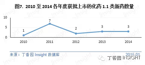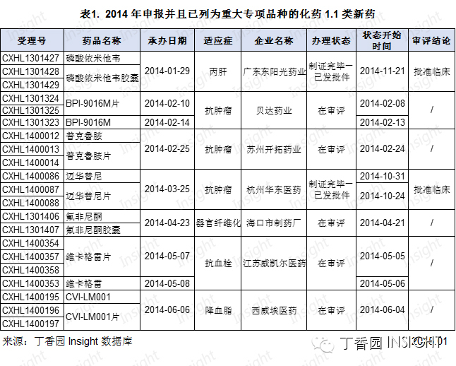 从上图可以看出,化药新药的申报量是在逐年攀升,且最近两年的申报量较往年同期相比增幅也在增大。其中 1.1 类和 3.1 类新药申报量也是如此。 近年来,国家鼓励创新,对一些创新药物、临床亟需药物设置特殊审评审批通道、审评资源向创新药物倾斜。制药企业研发能力的提升也是关键,与高校等科研机构及国外药品研发机构的合作等屡见不鲜。 ① 1.1 类新药 2014 年共有61个1.1类新药品种申报临床,3个申报上市 根据丁香园 Insight 数据库统计,2014 年 CDE 共承办化药 1.1 类新药新申请以受理号计达 155 个,涉及 64 个品种,抗肿瘤药物居多。这与 2013 年的 53 个品种相比,有所增加。其中有 61 个品种申报临床,3 个品种申报上市(银谷制药的苯环喹溴铵、天津红日药业的抗肿瘤药物对甲苯磺酰胺注射液、恩华药业的埃他卡林)。 江苏恒瑞全年共有 4 个品种申报临床(SHR3680、SHR4640、SHR6390、SHR7390),在数量上位居榜首。广东东阳光(依米他韦、莱洛替尼、博昔替尼)和兆科药业(生发肽、胸腺肽、司来普伐肽)分别有 3 个品种申报临床,并列第二。 值得关注的是,在这新申报临床的 61 个 1.1 类新药品种之中,有 7 个品种已列为重大专项品种,详细数据如下所示。其中,杭州华东医药的抗肿瘤药物迈华替尼和东阳光的抗丙肝药物依米他韦在2014年已获批临床。