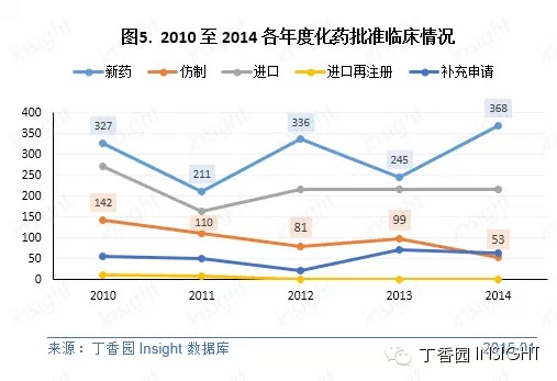 根据 Insight 数据库统计,2014 年 CFDA 共批准化药上市申请 421 个(以受理号计,未计入批准进口再注册和批准补充的数量),与 2013 年(483个)相比,有所减少,减幅达 15%。总体来看,近 5 年来化药批准上市数量是在逐年递减,且主要集中在仿制药上。近年来食药监局对国内仿制药的审评要求和质量把控在加强。