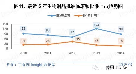 2014 年 CFDA 批准生物制品临床申请以受理号计有 90 个,批准生物制品上市申请18个,与2013年相比均有所减少。但同过去5年相比浮动倒也不大,维持在相对稳定状态。 总结 通过盘点 2014 年的药品申报受理及审评审批情况,我们对近年来医药行业的现状以及发展趋势或许已有所认识,药品申报量的逐年递增,仿制药的低水平重复,药品审评耗时的不断延长等等。 而对此我们也看到 CDE 在行动,在过去的一年里大幅增加审评人员招聘,发布电子刊物引导药品研发,发布过度重复药品目录引导企业理性申报等等。至于 2015 年这些现状能否得以改善,让我们拭目以待吧。
