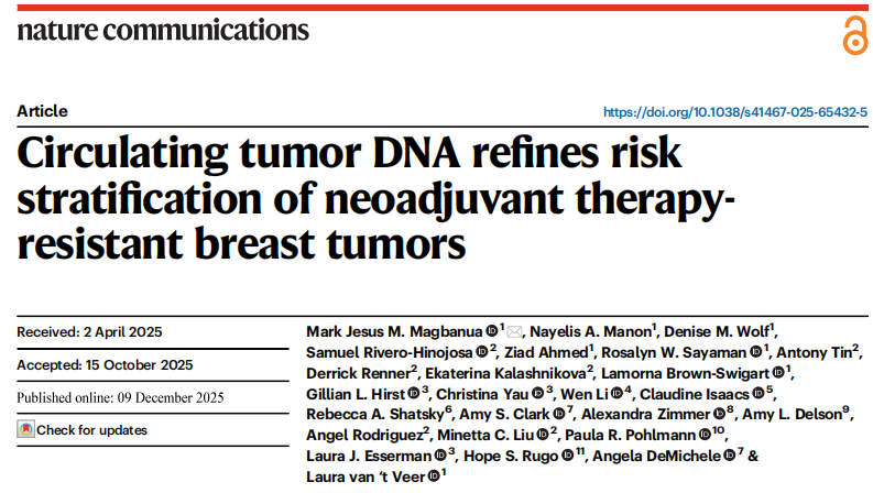 近日,来自UCSF的研究团队在杂志Nature communications上发表了一篇题为“Circulating tumor DNA refines risk stratification of neoadjuvant therapy resistant breast tumors”的文章。研究团队探索了使用循环肿瘤DNA(ctDNA)作为液体活检标志物,优化NAT耐药肿瘤的风险分层,并预测治疗反应。本研究通过大规模临床数据证实,ctDNA动态监测可显著优化NAT耐药乳腺癌的风险分层,早期清除(第3周)作为强预测指标为个体化治疗决策提供关键依据。在 NAT 耐药型肿瘤中,ctDNA 阴性或ctDNA的清除与较低的转移倾向相关。将NAT抵抗型肿瘤的风险分类细化为高转移风险和低转移风险,可以指导治疗决策(降级或升级),以避免过度治疗或克服对NAT的耐药性。