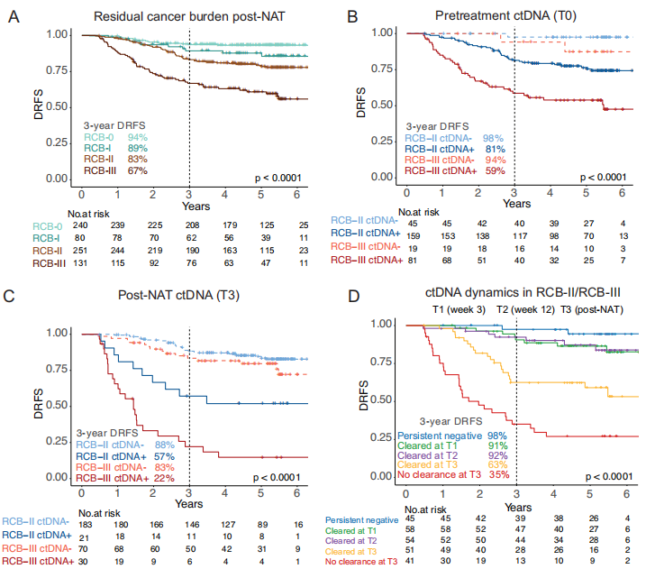 作者评估了ctDNA的预后意义,结果显示,治疗前(T0)的 ctDNA 阳性状态是转移性复发的独立预测因素(调整后的风险比=4.40);‌T3 ctDNA阳性是预后不良的强力指标(调整后风险比=5.20)。作者还评估了ct DNA清除时间的预后意义。结果显示,晚期清除(T3)和未清除均是疾病复发无进展生存期(DRFS)的显著独立不良预后因素(风险比分别达6.88和16.50)。