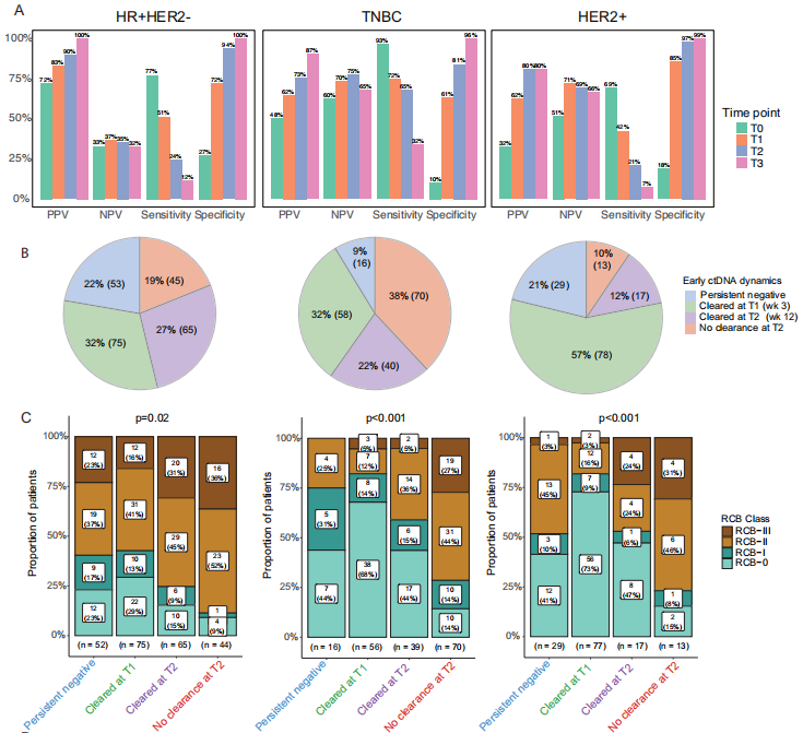 循环肿瘤DNA(ctDNA)动态变化显示,HER2 阳性组在第3周(T1)时ctDNA清除的比例最大,为57%,而HR阳性/HER2阴性组和TN组的比例分别为32%(图B)。进一步分析显示,T1时的ctDNA清除情况与NAT良好的治疗反应显著相关,早期ctDNA清除的患者中RCB-0/RCB-I的比例最高(HR 阳性/HER2 阴性:42%;TN:82%;HER2 阳性:82%)(图C)。对于不同的治疗方案,早期ctDNA清除同样能预测接受免疫检查点抑制剂(ICI)或HER2靶向药物治疗患者的良好反应。