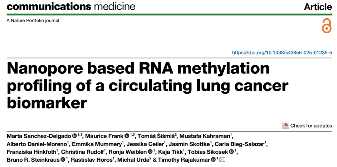 近日, 来自德国蜂鸟诊断公司的研究团队在杂志communications medicine上发表了一篇题为“Nanopore based RNA methylation profiling of a circulating lung cancer biomarker”的文章。本研究旨在利用纳米孔等第三代测序技术,开发一种能够对单个天然RNA分子进行直接测序、同时获取序列和化学修饰信息的方法。利用这一方法,作者揭示了肺癌患者血浆中28S4014-4035片段呈现完全双甲基化(GmCm)模式的比例显著升高,GC、GmC和GCm甲基化模式也相应显著减少。分析结果显示,GmCm甲基化比例是独立于年龄、性别和吸烟史等临床因素的肺癌诊断预测因子,诊断分类器的ROC为0.84,显示出作为肺癌诊断生物标志物的巨大潜力。