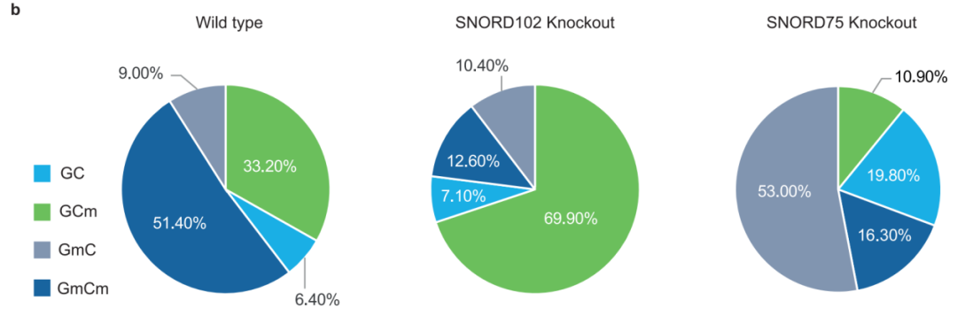 在HCC-827细胞模型实验中,作者使用该方法成功检测到了条件培养基中28S4014-4035片段的甲基化状态,G7位置的Nm修饰频率为60.4%, C19位置的Nm修饰频率为84.6%(图b)。并且对应的snoRNA基因(SNORD102和SNORD75)被敲除后,G7和C19位置的Nm显著下降。