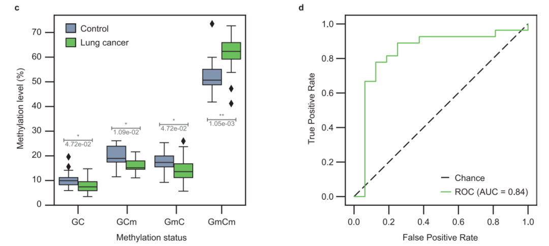逻辑回归模型分析显示,GmCm甲基化比例是独立于年龄、性别和吸烟史等临床因素的肺癌诊断预测因子。且GmCm甲基化比例这一指标在该队列中的受试者工作特征曲线下面积为0.84(图d),显示出作为肺癌诊断生物标志物的巨大潜力。