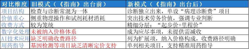 新指南实现了系统性重构,将病理服务清晰划分五大独立板块,使病理诊断服务不再是“耗材的附属品”,而是独立定价的专业服务。这是本次的核心看点。