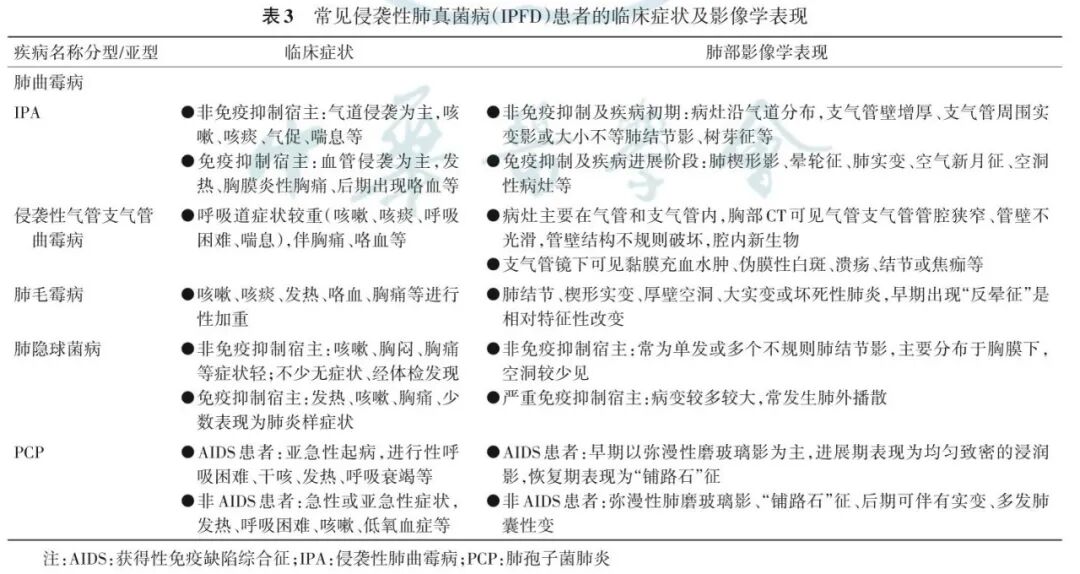 IPFD的危险因素包括了宿主因素和环境因素(表2)。免疫抑制宿主及ICU患者均是IPFD的高危人群。肺隐球菌病在国内更常见于免疫功能正常人群。控制不良的糖尿病是肺毛霉病首要的危险因素,近年来,异基因造血干细胞移植受者等血液病患者继发毛霉病的例数逐渐增多。CD4+T淋巴细胞减少是PCP的独立危险因素。基础疾病及相关治疗所致的免疫功能低下,导至非AIDS患者的IPFD发病率持续上升。此外,生物制剂和靶向药物引发的免疫受损,增加了真菌感染的风险。