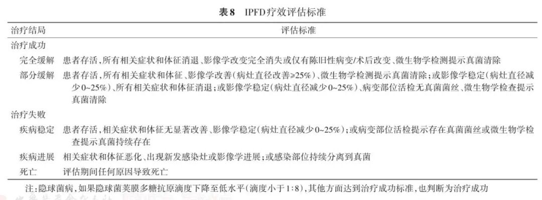 IPFD的疗效需要结合临床症状、体征、实验室检查及影像学结果进行综合评估。抗真菌治疗通常较抗细菌起效慢,有效者多在1~2周后临床症状和体征才开始改善,此时可初步进行疗效评估;重症应动态评估。疗效评估结果分为治疗成功(完全缓解、部分缓解)和治疗失败(疾病稳定、疾病进展、死亡)(表8)。