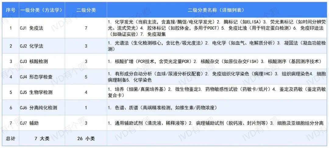 | 2025年的最后时刻,体外诊断行业人的心情,大概像坐过山车。在这个原本被预测为“政策大爆发”的年末,所有人的眼睛都死死盯着国家医保局的官网,等待着那份传说中将重塑行业价格体系的《检验立项指南》。然而,我们没等到“立项指南”的惊雷,却等来了《关于更新医保体外诊断试剂分类与代码数据库的通知》的细雨。伴随通知挂网的,是一份长达6266页、截止到2025年11月的维护信息数据库。很多同行在后台问我:“指南没发,是不是改革缓了?”立项指南是“价”,代码库是“实”。没有“实”的标准化,就无法定“价”的公平性。这份6266页的文档,正是为了给即将到来的立项改革铺设最坚硬的数字路基。今天,我们不妨在“让子弹再飞一会儿”的空窗期,静下心来,把这只已经落地的“靴子”——IVD分类代码体系,看个通透。  6266页的“行业地图”:从七大门派到114路招式这次更新的数据库,最大的看点在于其严密的分类逻辑。这不仅仅是编码,这是国家对IVD技术的官方定义。打开这份文档,你会发现整个IVD江湖被精准地划分为了7个一级分类、26个二级分类和114个三级分类。这套体系,就是未来所有试剂挂网、集采、付费的“直道”。为了让大家更直观地理解,我将这庞大的数据体系梳理如下:这两个类别占据了数据库90%以上的篇幅,是医院检验科的绝对主力。CJ1 免疫法(7个二级,34个三级) 这是目前IVD市场厮杀最激烈的红海。从底层的技术迭代看,分类极其详尽:- 化学发光(CJ101):细分到了直接、酶促、电化学、磁微粒等10个三级分类。这意味着,未来集采分组可能不会再是一锅粥,而是依据这些细微的技术差异进行科学分组。
