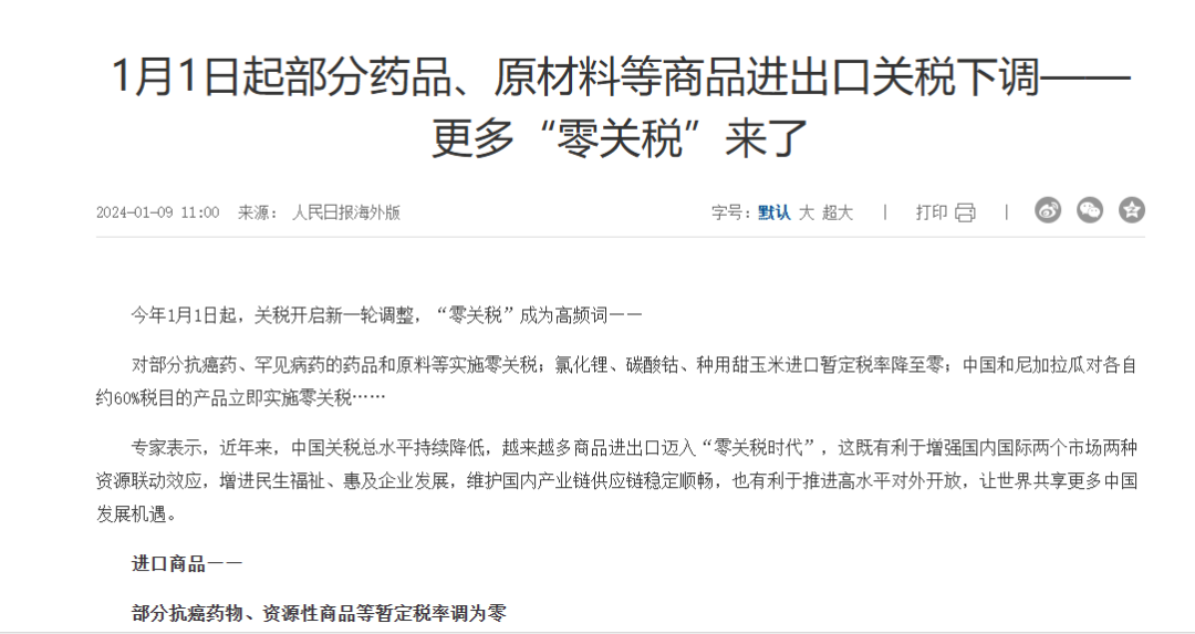 国务院关税税则委员会日前宣布,自2026年1月1日起,降低部分传染病诊断试剂盒进口关税至零,同时降低人造血管等医疗产品进口关税。