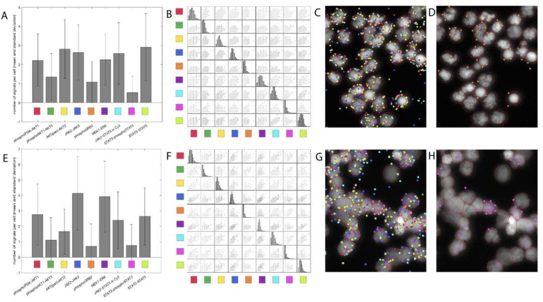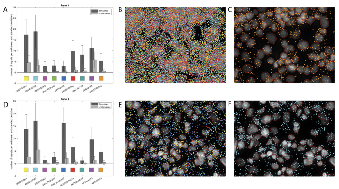 在培养的SK-BR-3细胞中,他们用EGF(表皮生长因子)刺激细胞,模拟癌症中常见的信号通路激活。利用misPLA,他们成功同时可视化了STAT5a、STAT3、AKT、ERK和EGFR等关键信号蛋白的磷酸化状态变化。在未刺激的细胞中,这些信号微弱;而一旦受到EGF刺激,代表蛋白质激活的荧光信号点便大量出现,清晰地展示了信号通路的即时启动。