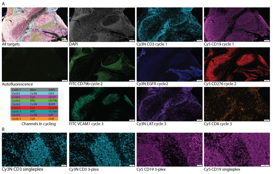 技术的潜力远不止于此。研究团队还应用了一个九重免疫谱系/粘附分子检测组合,在扁桃体样本中同时绘制了 CD3、CD8、CD19、CD79b、EGFR 等多种标志物的空间分布。结果清晰地区分出富含T细胞的副皮质区、B细胞聚集的滤泡区、生发中心等结构,展示了免疫细胞在组织中的精确定位和空间关系。与单一检测相比,多重检测并未牺牲灵敏度或特异性,证明了其在高丰度蛋白检测中的可靠性。