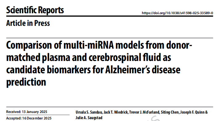 近日,一组来自俄勒冈健康与科学大学(OHSU)的研究团队在杂志Scientific Reports上发表了一篇题为“Comparison of multi-miRNA models from donormatched plasma and cerebrospinal fluid as candidate biomarkers for Alzheimer’s disease prediction”的文章。本研究比较了从匹配的血浆和脑脊液中提取的57 种miRNA,以评估它们作为AD生物标志物的潜力。结果显示,血浆样本对低浓度miRNA的‌检测敏感性更高,‌数据质量更佳,技术重复的测量一致性也更强。将血浆miRNA与临床信息联用后,其分类能力(AUC = 0.864)与CSF蛋白标志物类似‌。结合血浆miRNA、临床预测因子以及CSF蛋白标志物的多指标模型具有最佳性能(AUC = 0.958)。而且,‌基于血浆miR-23a-3p与miR-423-5p的简约双指标模型更具临床实用性。