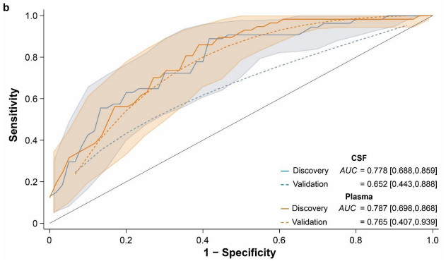 研究人员分别利用CSF和血浆中57个候选miRNA的标准化表达数据,构建了AD预测模型。结果显示,‌在发现队列中‌,基于CSF和基于血浆的miRNA模型都表现出相似的分类能力(AUC约为0.78)。‌然而,在独立验证队列中,基于血浆的模型维持了其高预测性能,AUC = 0.77;基于CSF的模型在验证中性能显著下降,AUC值降低至0.65(图 b)‌。这些结果说明,血浆比脑脊液中miRNA 的 RT-qPCR 测量更可靠,且受队列依赖性影响更小。