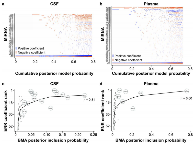 研究进一步探讨了脑脊液或血浆中的单个miRNA 对 AD 预测模型的重要性。分析显示,CSF中,57个miRNA里有38个达到重要性阈值(PIP > 0.01)(图a);‌在血浆中,有56个达到阈值(图b)‌。AD相关的miRNA表达变化在CSF和血浆中几乎没有关联性。例如,在血浆中AD关联性最强的miR-23-3p(正关联)和miR-423-5p(负关联),在CSF中关联性近乎为零。这表明,脑脊液和血浆中的miRNA谱提供了互补而非相同的疾病信息。