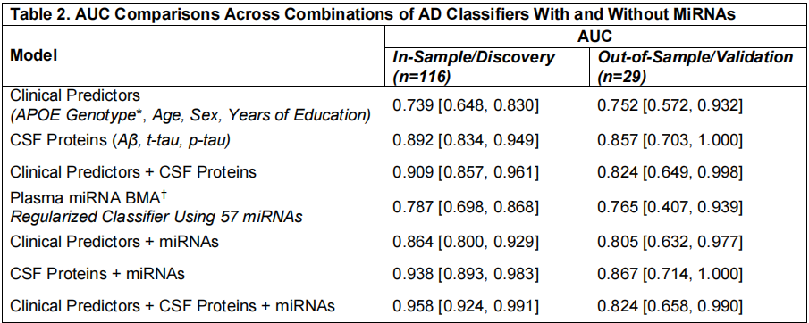 研究将血浆miRNA模型与已知的预测指标进行了比较,并研究了将指标联用是否能提高诊断准确性。结果显示,‌血浆miRNA模型(AUC = 0.787)单独使用时,其表现优于临床信息(APOE、年龄、性别、教育)的模型(AUC = 0.739),但略逊于CSF蛋白标志物(AUC = 0.892)(如下表)。将血浆miRNA与临床信息联用后,其分类能力(AUC = 0.864)与CSF蛋白标志物类似‌。将血浆miRNA模型与CSF蛋白标志物联用后,构建的多重标志物模型实现了最优的预测性能。这表明,血浆miRNA模型与临床信息的结合,有望为患者提供一个与有创性腰椎穿刺获取的CSF蛋白检测效力相当、但更易接受的无创AD风险预测方案。