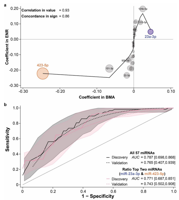 ‌基于miR-23a-3p与miR-423-5p的双指标模型性能。图片来源:Scientific Reports