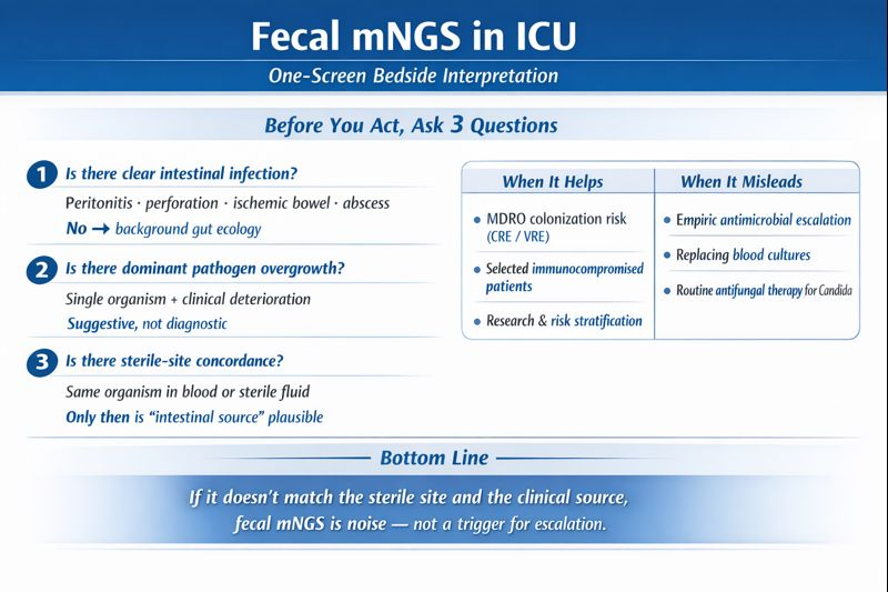 3)把粪便 mNGS 视为“背景与风险提示”,除非它与无菌部位证据形成闭环。