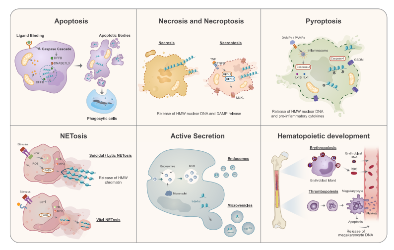 图1. cfDNA七大来源:凋亡、坏死、坏死性凋亡、焦亡、中性粒细胞胞外诱捕、细胞外囊泡主动释放、成红血细胞和巨核细胞凋亡来源