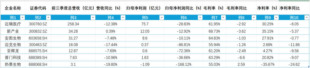 迈克生物和亚辉龙在盈利端承压更为明显,归母净利润同比降幅均超70%,而热景生物的亏损进一步扩大,前三季度归母净利润为-1.09亿元,同比下滑幅度高达168.12%。