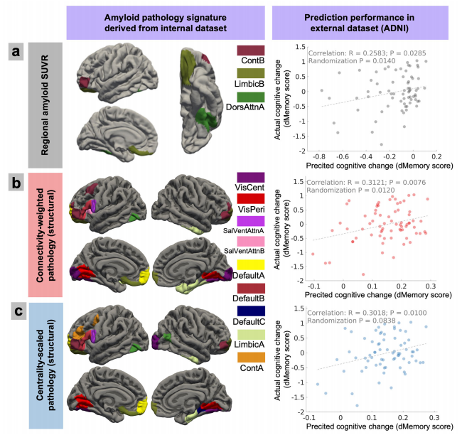 近日,美国哥伦比亚大学联合其他机构在杂志Communications Medicine上发表了一篇题为“Integrating individualized connectome with amyloid pathology improves predictive modeling of future cognitive decline”的文章。作者将Aβ病理的空间分布与个体大脑网络架构相结合,构建了基于网络的Aβ负担的指标。研究结果表明,将个性化的结构连接组而不是功能连接组信息纳入Aβ测量可以提高对预期认知衰退的预测性能。 图片来源:Communications Medicine 主要内容 结合个体大脑网络架构的Aβ病理学指标的构建 研究者利用扩散磁共振成像获取个体化结构连接组,利用静息态功能磁共振成像获取功能连接组,并分别与淀粉样蛋白PET的区域数据结合,生成了基于结构连接和基于功能连接的两类NAP分数。 其中,连通性加权NAP(图e和h)不仅考虑了目标脑区本身的淀粉样蛋白沉积,还通过结构或功能连接矩阵,将与之相连的其他所有脑区的淀粉样蛋白沉积进行加权求和。中心性标度NAP(图f, i)将目标脑区自身的淀粉样蛋白沉积水平,按该脑区在整个连接网络中的“中心性”(即节点强度)进行校正。 基于网络的β淀粉样蛋白病理学(NAP)。图片来源:Communications Medicine 基于结构连接组的Aβ模型改善了对随后认知衰退的预测 作者评估了两种NAP指标在预测纵向认知能力下降方面的性能,并将其与使用Aβ病理PET成像标准化摄取值比(SUVR)值的预测性能进行比较。 交叉验证模型证实,仅使用基线区域性淀粉样蛋白SUVR即可显著预测后续全球认知分数的下降(中位相关系数 R=0.2013)。当将个体化的结构连接组信息整合到淀粉样蛋白指标中(基于结构的连通性加权NAP)时,预测未来全局认知衰退的性能达到了最高(中位相关系数 R=0.2754)(图a,b),其性能显著优于仅使用区域SUVR的传统方法。基于结构的其他NAP指标也显示出类似的优势。 与基于结构的连接组相反,功能连接组构建的NAP指标,未能提升预测性能甚至差于区域SUVR模型(图a,b)。这可能是因为淀粉样蛋白等错误折叠蛋白的跨突触传播可能更直接地由结构性解剖连接所介导,考虑淀粉样蛋白在个体结构性神经网络中的分布模式,能更有效地捕捉其与认知功能恶化之间的复杂关系。 不同病理模型下认知衰退预测的性能表现。图片来源:Communications Medicine 对预测认知衰退贡献最大的脑区 为了识别大脑ROI对观察到的病理和认知之间的关系贡献,作者对每个ROI的病理特征和认知变化进行相关性分析。分析结果显示,颞叶和枕叶的基底皮质区域以及内侧前额叶皮层和左背外侧前额叶皮层,表现出更强的纵向认知变化负相关(图b)。在高亮区域(红色显示)淀粉样蛋白病理水平较高的个体,认知能力下降的速度往往更快,而在这些区域淀粉样蛋白负担较低的个体,认知能力下降的速度往往较慢。此外,与区域SUVR评分相比(图c),NAP评分与纵向认知变化表现出更明显的负相关(图b)。 区域标准化摄取值比(SUVR)和基于网络的β淀粉样蛋白病理(NAP)图。图片来源:Communications Medicine 外部数据集验证模型的泛化性能 在独立的ADNI外部数据集中,作者利用从内部队列中识别出的同一组特征脑区(无论是区域SUVR还是结构连通性加权NAP)所提取的特征,预测结果与实际的认知下降的得分成绩(dMemory)均显著相关(如下图)。且在相关分析中,NAP指标(尤其是连通性加权)与认知变化之间的负相关关系也显著强于区域SUVR指标,表明其对认知衰退具有更高的敏感性。 Aβ神经病理学特征的外部验证。图片来源:Communications Medicine 观察到的NAP测量与纵向认知能力下降之间的关系不能完全用tau病理学来解释 鉴于tau PET测量与认知能力下降密切相关,作者进一步测试了认知和淀粉样蛋白之间的关系是否可以用tau病理学来解释。在拥有tau PET数据的子样本中进行的分析表明,淀粉样蛋白NAP指标与认知衰退的关联,在校正了全局或颞叶tau病理后依然显著。这说明NAP所捕获的认知衰退预测信息不能完全由tau病理负担来解释,提示了其独立的价值。 |