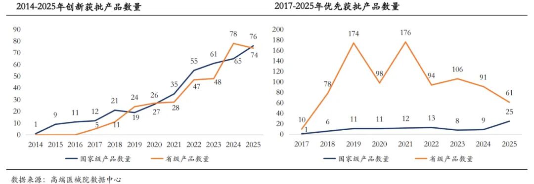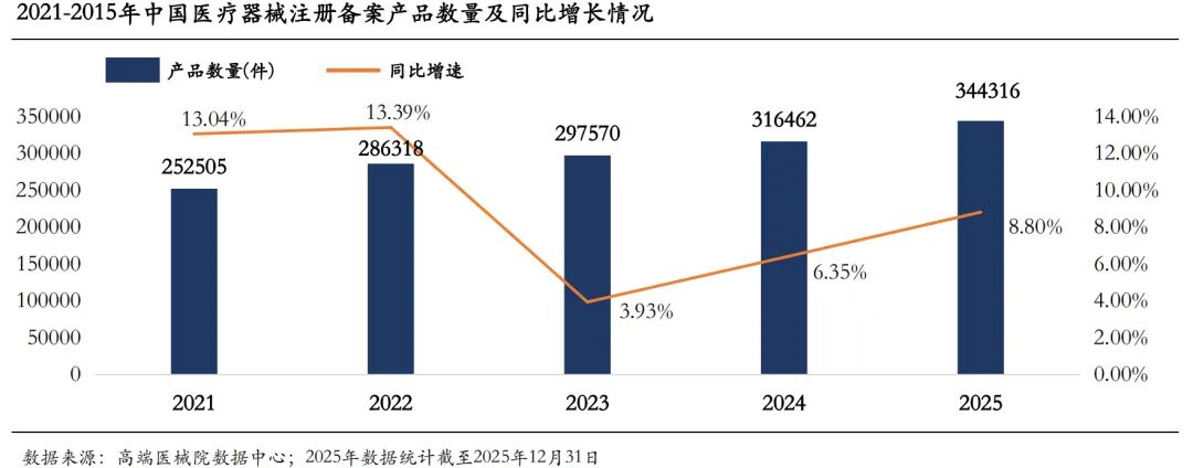 从产品结构来看,我国医疗器械产品数量持续扩容,Ⅰ类、Ⅱ类器械保持快速发展态势,Ⅲ类器械实现稳健增长,但高附加值的三类器械领域仍存在较大提升空间,产品原创性与创新性亟待加强。据统计,2025年底全国医疗器械产品总量达344316件,较2024年同比增长8.80%,其中Ⅰ类器械增幅最为显著;剔除体外诊断(IVD)品类后,各细分领域发展分化明显,近年来医疗器械年获批上市数量整体趋于谨慎,监管趋严的态势特征突出。
