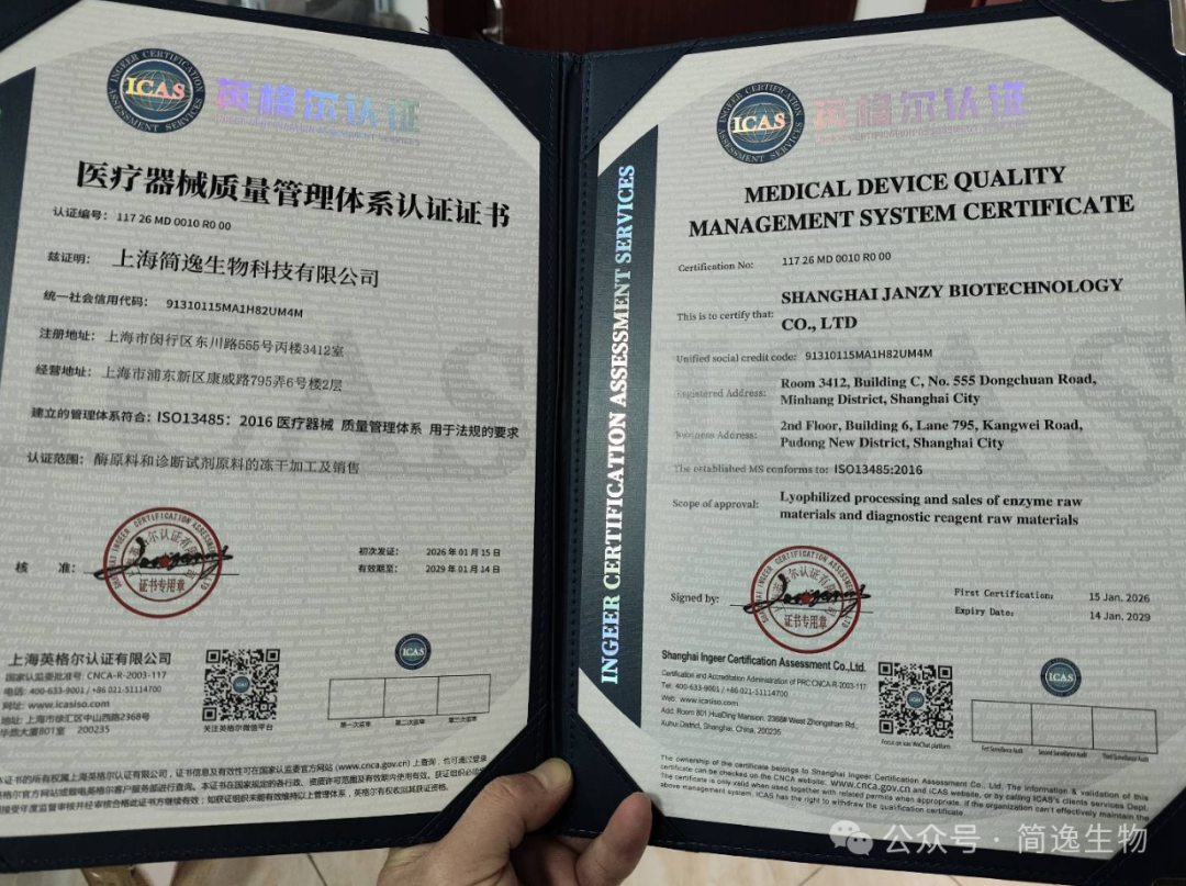 喜讯:简逸生物新生产基地已正式通过ISO 13485医疗器械质量管理体系认证,标志着我们的冻干试剂生产迈入合规化、规模化、体系化的全新阶段。
