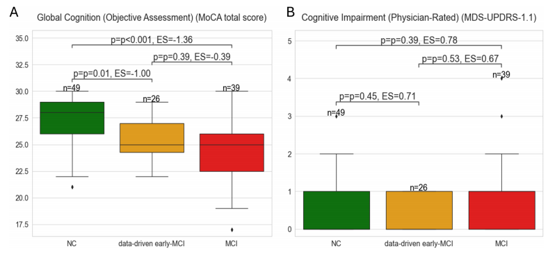 作者比较了数据驱动模型和临床测试两种方法对同一批PD患者的分类结果,并深入研究了判定不一致的两组。模型识别出了‌26名‌被数据驱动模型分类为MCI、但被临床金标准判定为认知正常的患者。分析结果显示,“‌数据驱动模型判定的早期MCI组‌”‌MoCA总分‌显著低于认知正常组,表明其全局认知功能更差(下图 A)。然而,在医生评定的MDS-UPDRS 1.1得分上,两组无显著差异,提示该评分敏感性不足(下图B)。